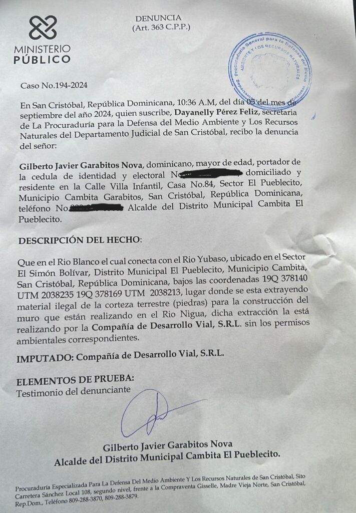 San Cristóbal, República Dominicana.– El alcalde del Distrito Municipal El Pueblecito, Gilberto Javier Garabitos Nova, perteneciente al partido Fuerza del Pueblo, presentó una denuncia formal ante la Procuraduría para la Defensa del Medio Ambiente contra la empresa Compañía de Desarrollo Vial, S.R.L., acusada de realizar extracción ilegal de materiales en el Río Blanco, Cambita Garabitos.