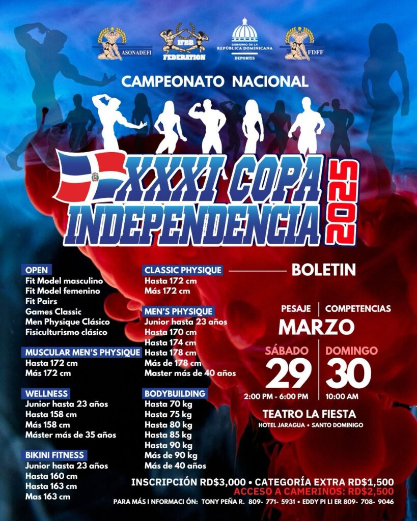 DISTRITO NACIONAL, República Dominicana.- Esperando récord de atletas participantes, masculinos y femeninos, en 7 divisiones que agrupan 31 categorías, fue anunciada con entusiasmo, la XXXI Copa Independencia de Fisiculturismo y Fitness, a celebrarse el próximo domingo desde las 10:00am, en el teatro La Fiesta, del hotel Jaragua, en la capital dominicana.