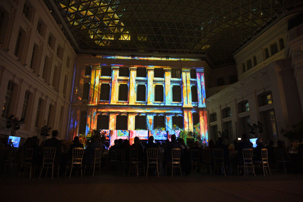 Previo a la cena, los asistentes disfrutaron en el atrio central de una proyección de video mapping inmersivo, que unió arte, música y tecnología en un lienzo vivo con imágenes de la flora, fauna, arquitectura, monumentos y países dominicanos, que se fundieron con las pinceladas de grandes maestros de la pintura nacional.
