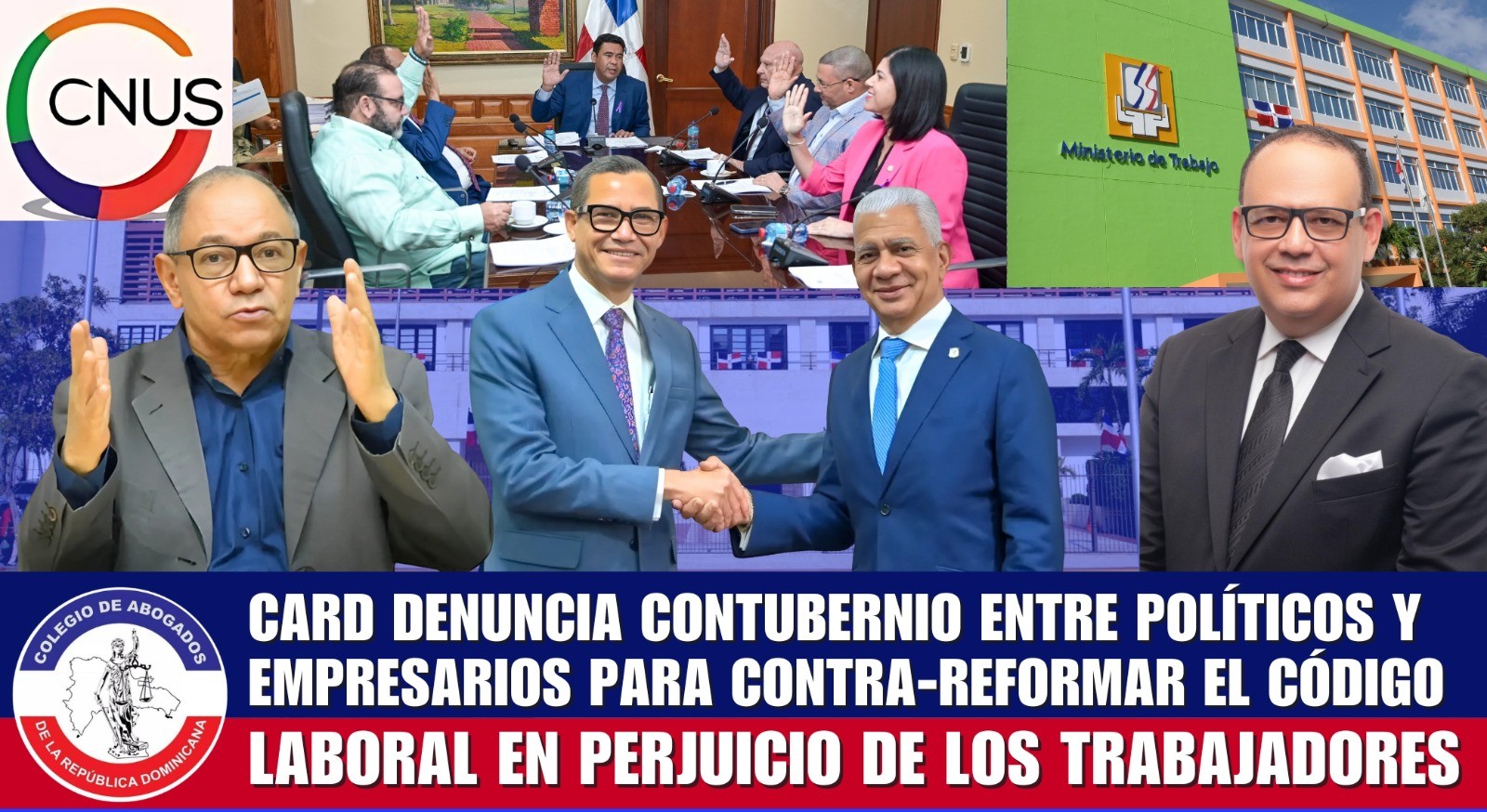 Santo Domingo, República Dominicana – 07 de marzo de 2025. –El Colegio de Abogados de la República Dominicana (CARD), presidido por el jurista Trajano Vidal Potentini, denunció la existencia de un preocupante contubernio entre sectores políticos y empresariales con la finalidad de impulsar una contra-reforma del Código de Trabajo que atenta contra los derechos y conquistas de los trabajadores dominicanos.