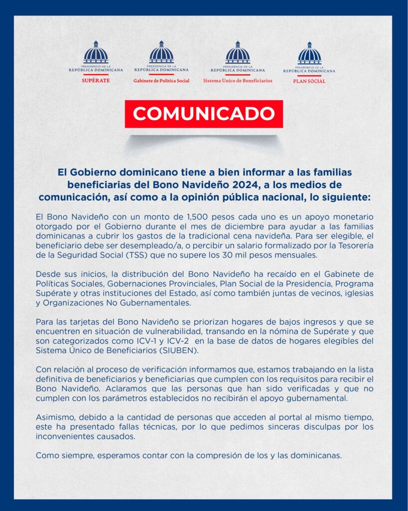 El Gobierno dominicano tiene a bien informar a las familias beneficiarias del Bono Navideño 2024, a los medios de comunicación, así como a la opinión pública nacional, lo siguiente: