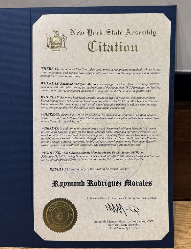 “El Congreso de los Estados Unidos, la Cámara de Representantes y el Congresista Adriano Espaillat representante del Decimotercer Distrito Congresual de Nueva York en la Cámara de Representantes de los Estados Unidos, nos sentimos honrados al reconocer a Raymond Rodriguez Morales, por su dedicación y esfuerzo por el bienestar colectivo, su contribución al desarrollo social y su impacto positivo en la República Dominicana”, expresa el reconocimiento.
