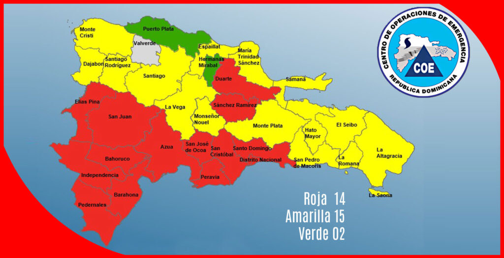 El COE mantiene a 14 provincias en alerta roja, incrementa 15 en amarilla y coloca 02 en verde por posible crecida de ríos, arroyos y cañadas debido a que fuertes aguaceros, tormentas eléctricas y ráfagas de viento continúan produciéndose en varias provincias del país asociados al disturbio tropical.