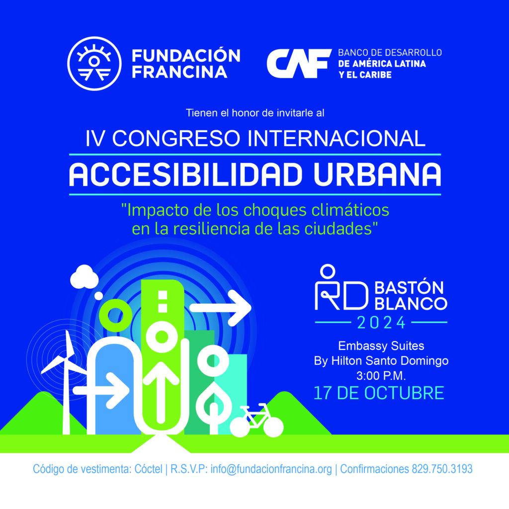 Santo Domingo. La Fundación Francina llevará a cabo el IV Congreso Internacional de Accesibilidad Urbana, el próximo 17 de octubre en el Hotel Embassy Suites By Hilton, Santo Domingo. El evento, que marca el cierre de la campaña Bastón Blanco 2024, abordará el tema “Impacto de los choques climáticos en la resiliencia de las ciudades”.