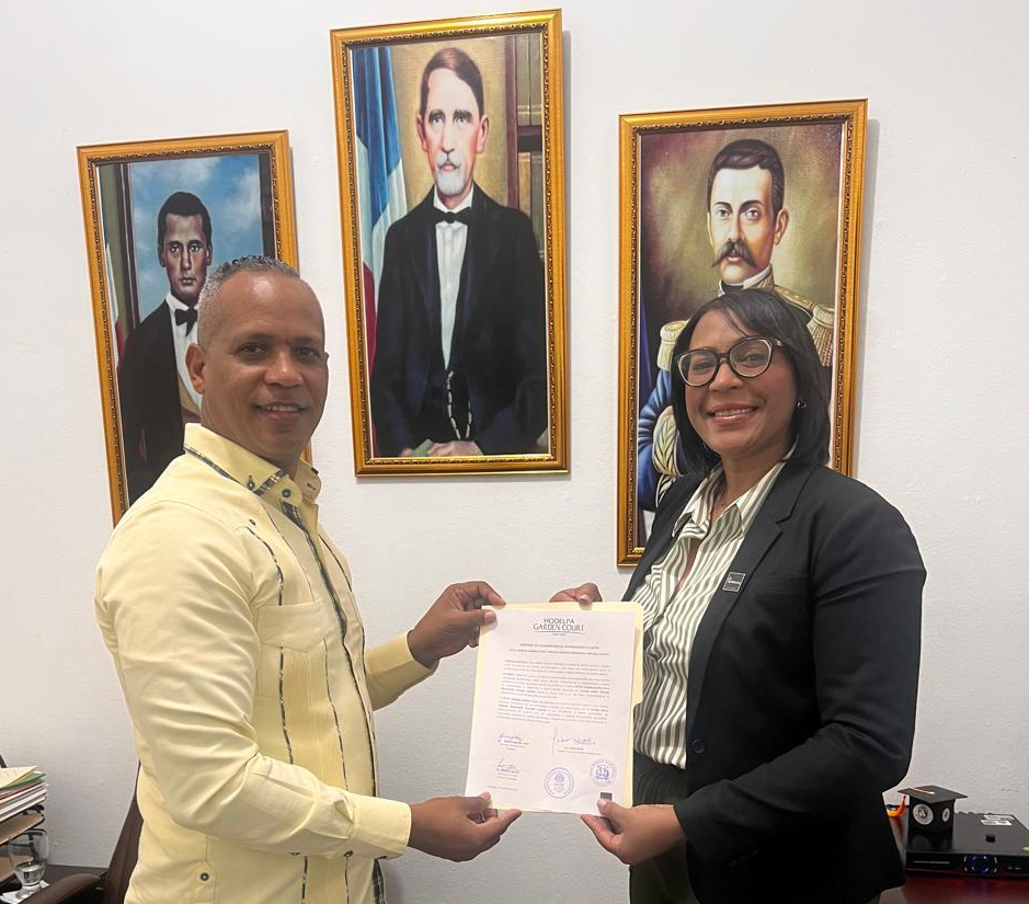 La alianza fue firmada por la Sra. Yliana Boitel, gerente del Hodelpa Garden Court; la Lic. Amarilis Morel, directora del centro educativo; y el Lic. Richard Ignacio Báez, director del Distrito Educativo 08-03 del Ministerio de Educación.
