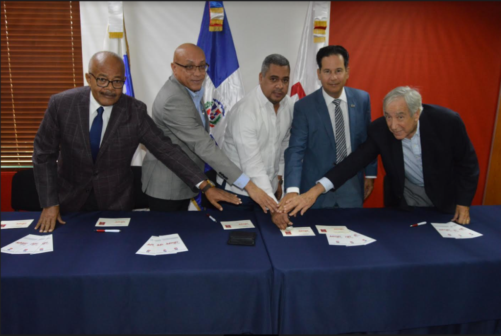 Oscar Pared, miembro de la Comisión Oficial Filatélica, Juan Miguel Madera, vicepresidente ejecutivo de ARAPF, Erick Guzmán, director general del Inposdom, Juan José Alorda, presidente de ARAPF y Pedro García Troncoso, pasado presidente e hijo del fundador de ARAPF.