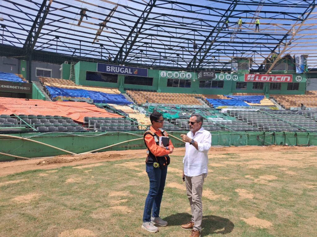 SANTO DOMINGO.- El Comisionado Nacional de Béisbol, Junior Noboa, junto a la arquitecta Penélope Valdez, directora de Proyectos de la Presidencia, ven con buenos ojos los trabajos de remodelación que realiza el Gobierno dominicano en el Estadio Tetelo Vargas, de San Pedro de Macorís.