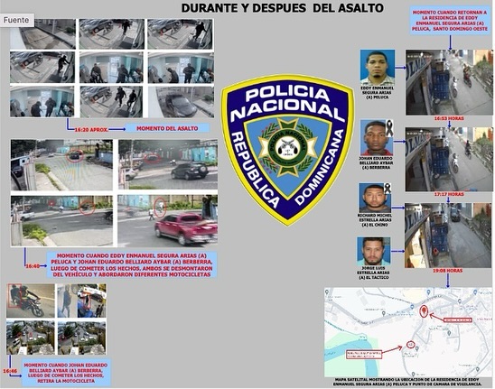 También reiteró que el dinero no ha sido recuperado y aseguró que la Policía Nacional posee las pruebas que confirman la participación directa de cuatro individuos en el asalto. El robo, a mano armada, fue planificado por Jorge Luis Estrellas Arias, de 36 años, con la participación de su hermano Richard Michel Estrella Arias, de 25 años, ultimado por agentes de la institución; su primo Eddy Enmanuel Segura Arias, de 26 años, y Johan Eduardo Belliard Aybar, de 24 años, quien también cayó abatido en un «intercambio de disparos».