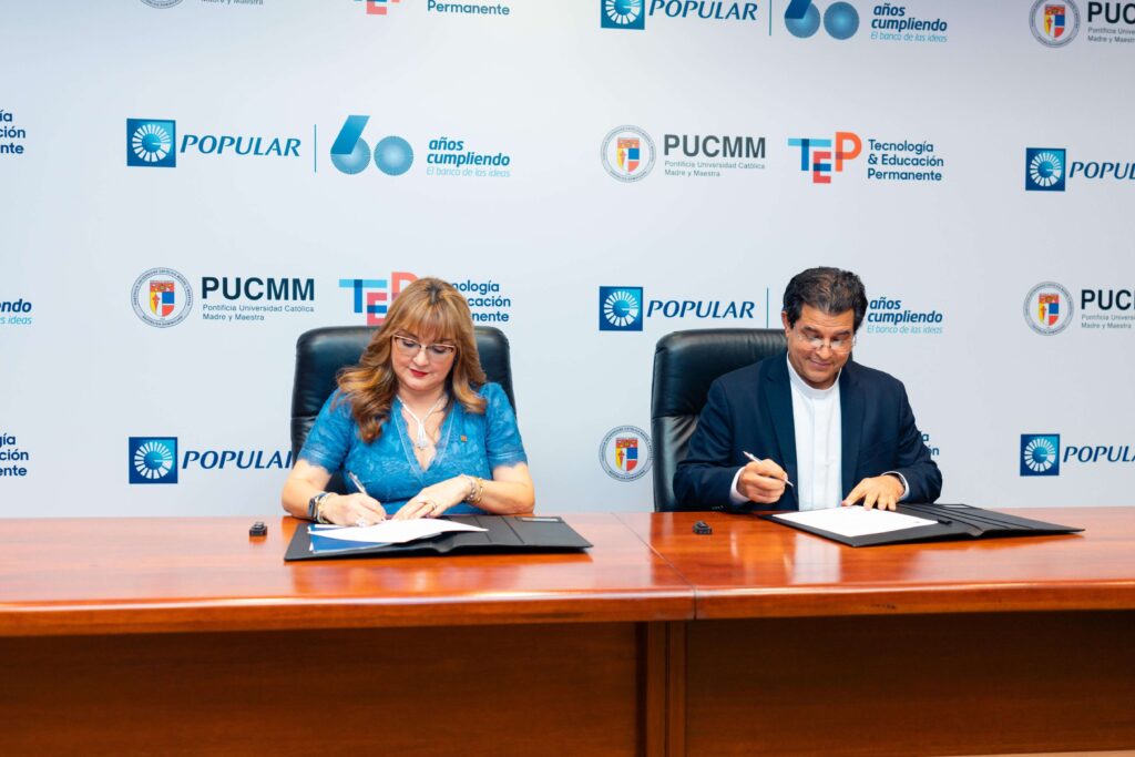 Santo Domingo, D.N. – El Banco Popular Dominicano y la Pontificia Universidad Católica Madre y Maestra (PUCMM) firmaron un acuerdo para implementar el programa de Grado Técnico Superior en Gestión Bancaria, una iniciativa educativa diseñada exclusivamente para el personal del banco que trabaja en las sucursales de la organización financiera, con el objetivo de continuar fortaleciendo su perfil profesional y brindar oportunidades de crecimiento interno.