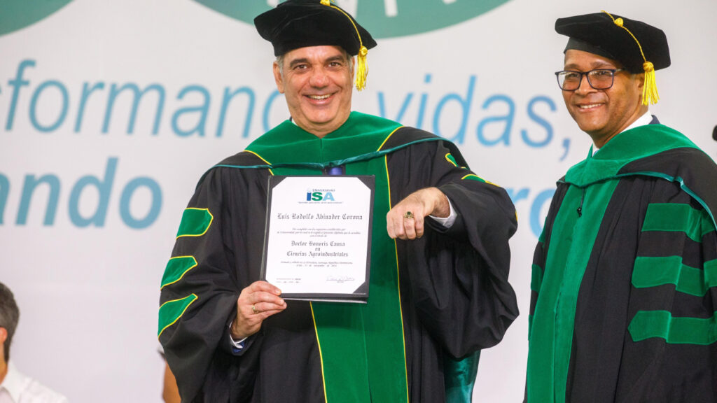 Santiago.- El presidente Luis Abinader recibió este sábado el título “doctor honoris causa” en Ciencias Agroindustriales, la más alta distinción, otorgada por la Universidad ISA, en reconocimiento de su liderazgo visionario y las iniciativas impulsadas para fortalecer los programas educativos y el sector agroindustrial y productivo del país.